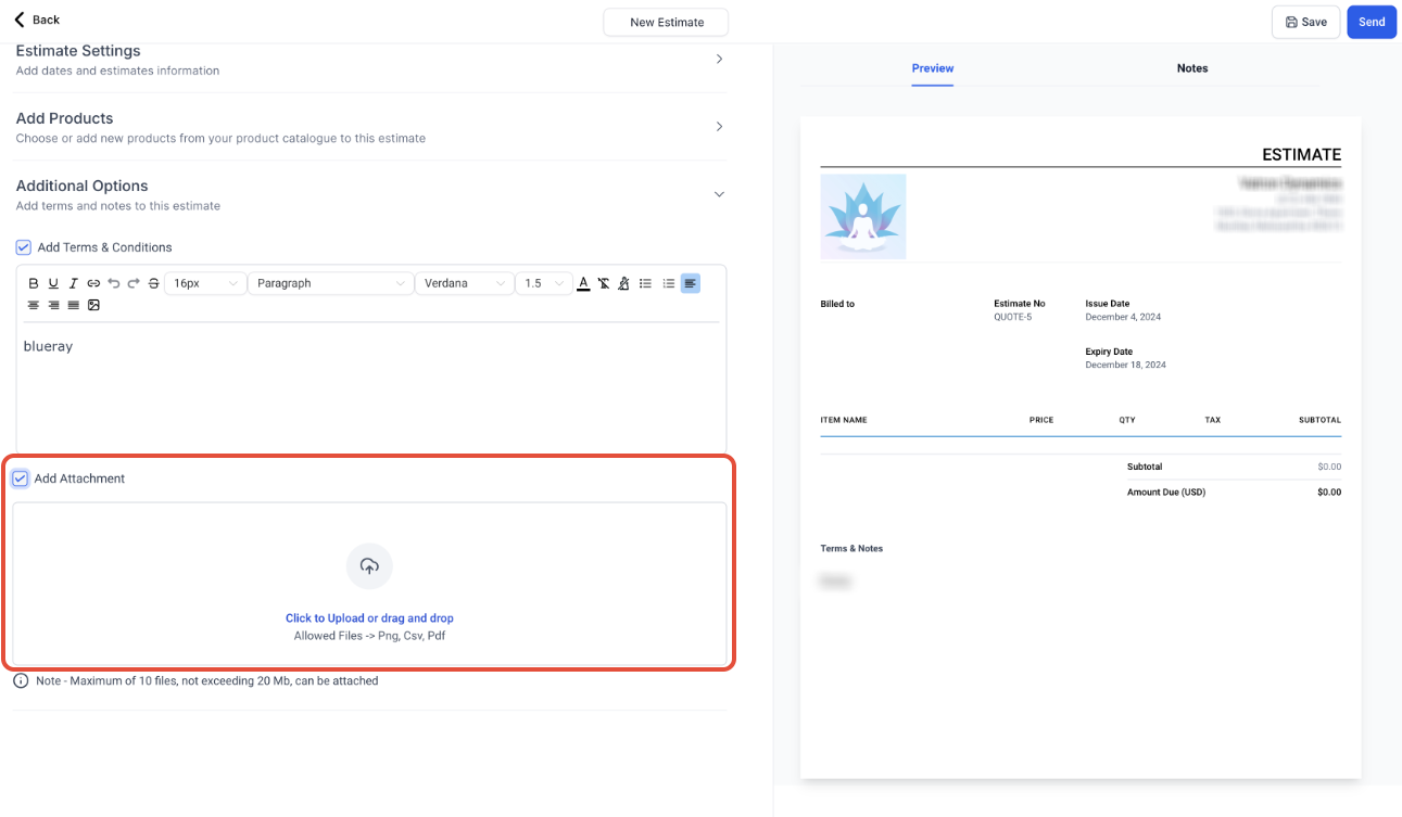 Now you can attach up to 10 files to your estimates and invoices in Media Shield. This feature allows you to send additional documents like specifications, terms, or visuals alongside your estimates. Here’s how to use it: